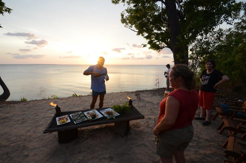 Each evening sunset nibbles are served on the cliff top; the perfect vantage point to watch the sun set over the bay. Dinners of a high standard are prepared in the camp kitchen nightly and incorporate freshly caught seafood, fresh vegetables and a variety of local produce.
