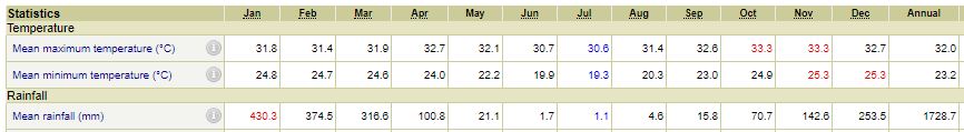 Below is a great table from the Bureau of Meteorology showing Darwin's rainfall and temperature statistics for each month averaged over the past 80 years. This gives you a good idea of how hot it can be and also when the rain falls. It's worth also noting that for a great majority of the wet season the rain is very sporadic (often occurring late-afternoon or at night) so you can still get out and about for a lot of the time.